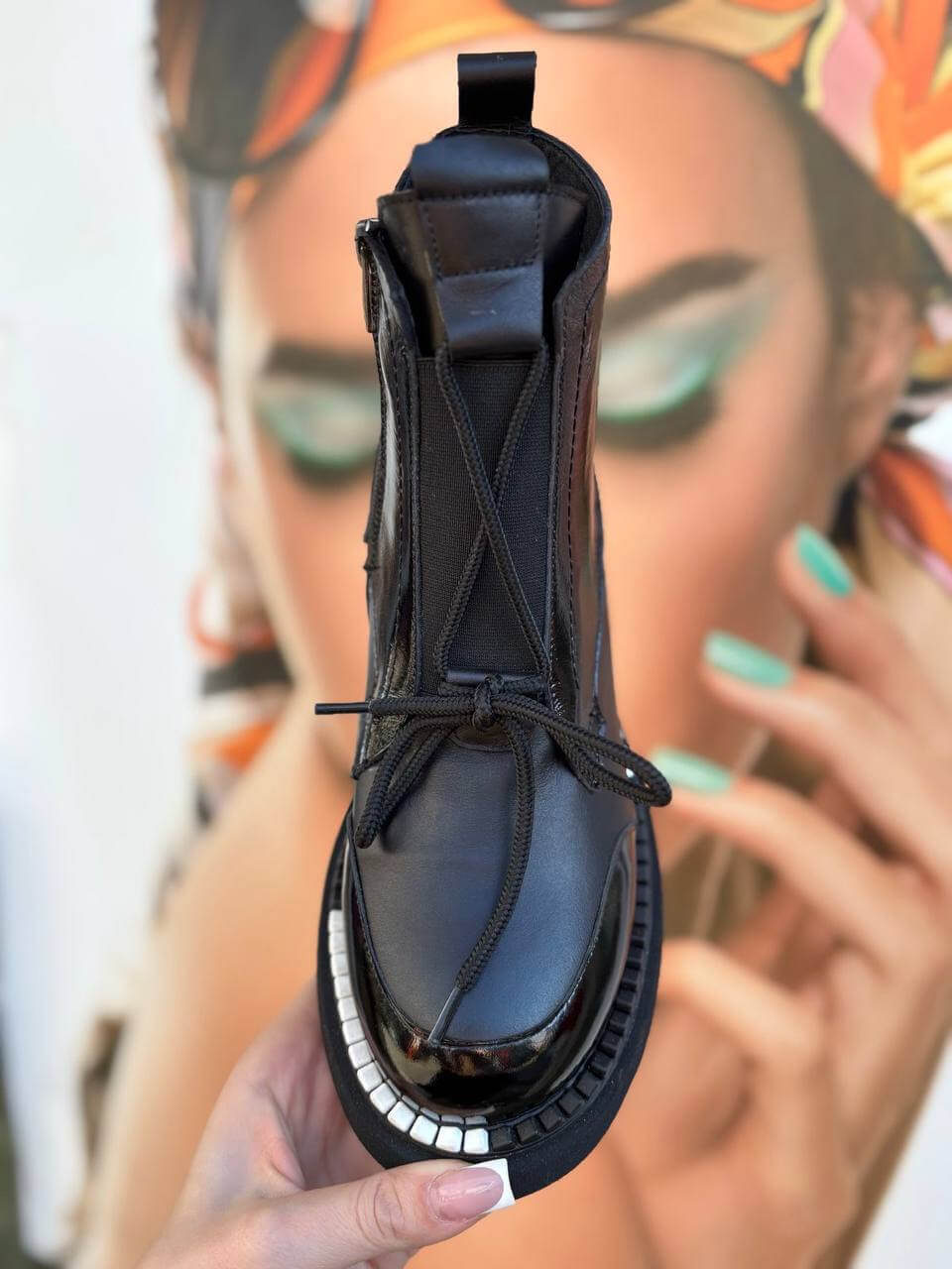 Міські шнурівні черевики з поєднанням матової та глянцевої шкіри. Легка неслизька підошва з масивним каблуком і декоративною обв’язкою по ранту, м’який язичок та зручна колодка — стиль і комфорт на кожен день