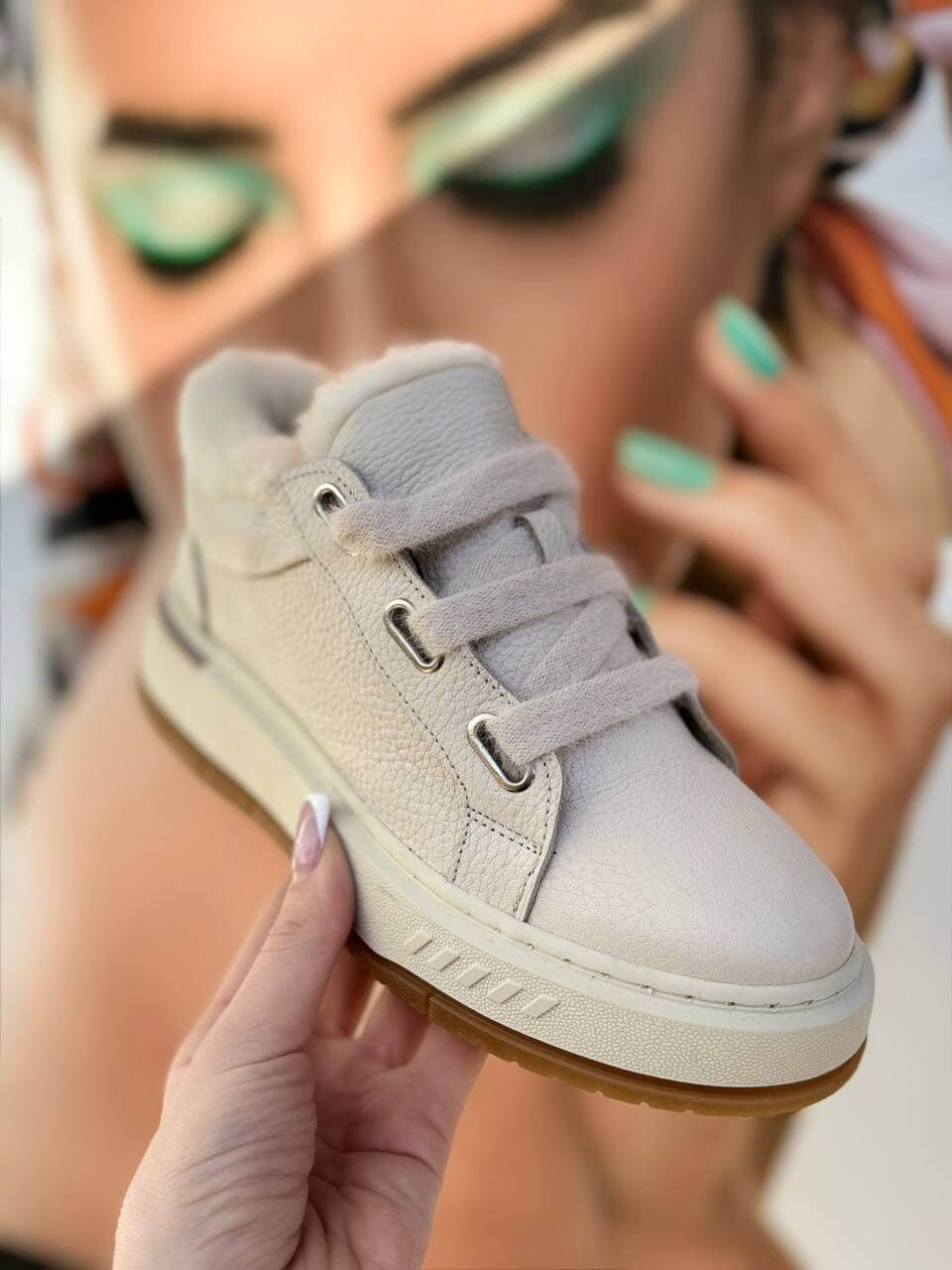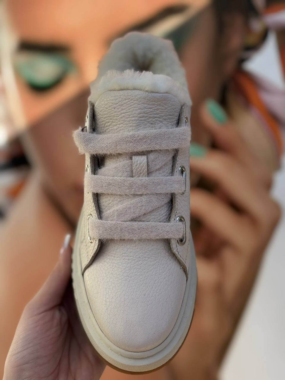 Теплі кремові кросівки з м’яким хутряним утепленням. Зерниста шкіра, широкий шнурок, металева фурнітура та амортизувальна неслизька підошва — ідеальні для щодня в холодну погоду
